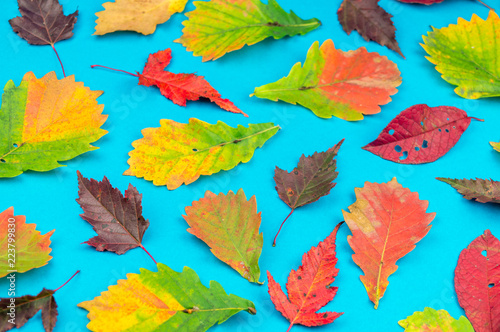 Obraz premium Multicolored autumn leaf on a soft blue background