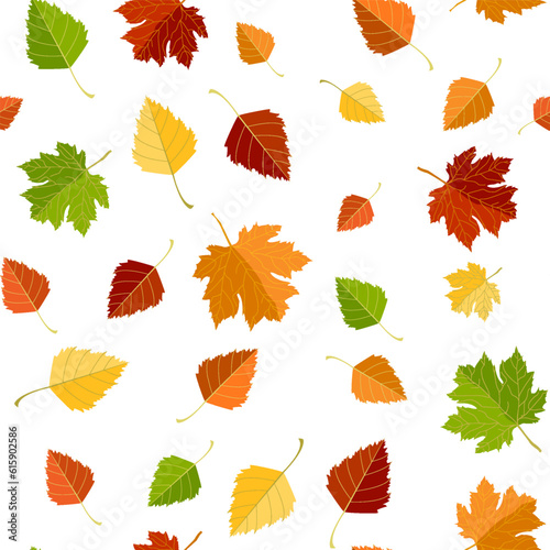 Fototapeta premium Multicolored autumn seamless pattern of autumn maple and birch leaves on a white or transparent background