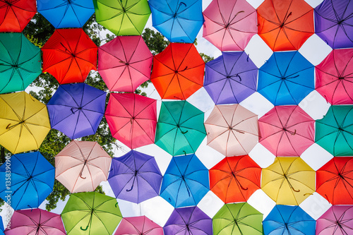 Fototapeta premium multicolored bright colorful umbrellas decoration on festive street in...