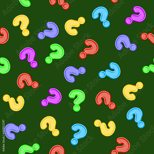 © ReflectedCrafts, Obraz premium multicolored 3d question marks on a dark green background, seamless pattern