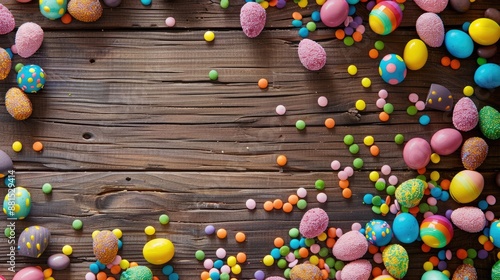Obraz premium Multicolored Easter sweets on a wooden backdrop