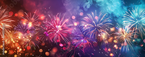 Naklejka premium Multicolored fireworks creating a vibrant scene, with a dark bottom section...