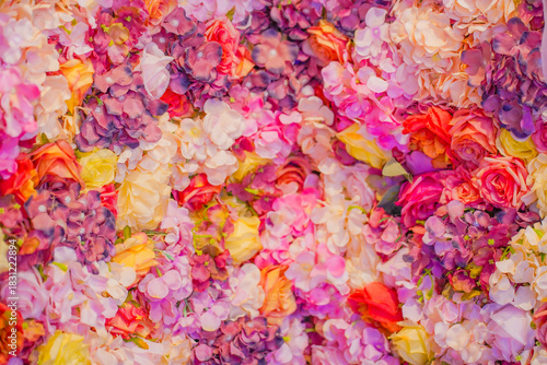 © hakofac, Obraz premium 多色の花びらの密集した配置 / Multicolored flower petals in dense arrangement