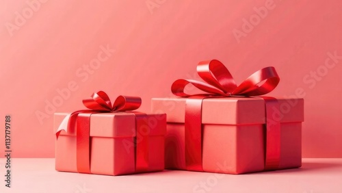 © Sergei, Obraz premium multicolored, gift boxes in a beautiful festive wrapper, hearts free space for advertising, on a light background, three te