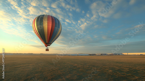 © Mahnoor, Naklejka premium Multicolored hot air balloon landing in grassy field , Hot air balloon in the blue sky , Colorful hot air balloon flying in the sky over the countryside