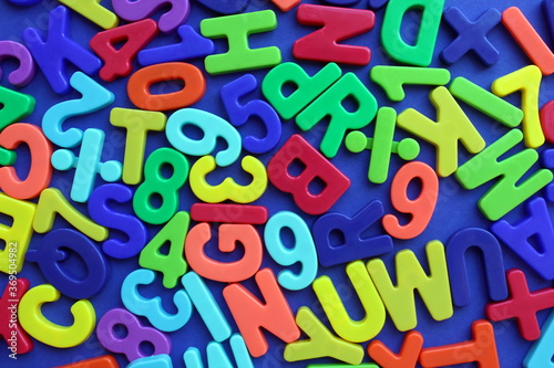 Fototapeta premium Multicolored letters and numbers on a blue background