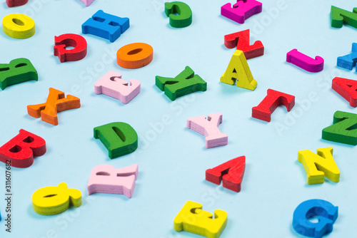 © Nikolay, Naklejka premium Multicolored letters on a blue background.