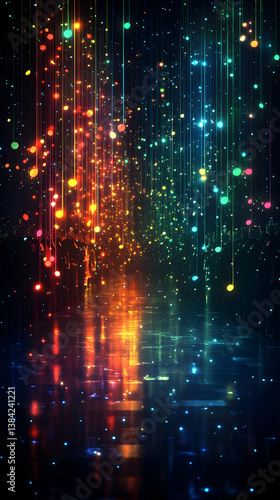 Fototapeta premium Multicolored light streaks and bokeh cascade down into a glowing reflective...