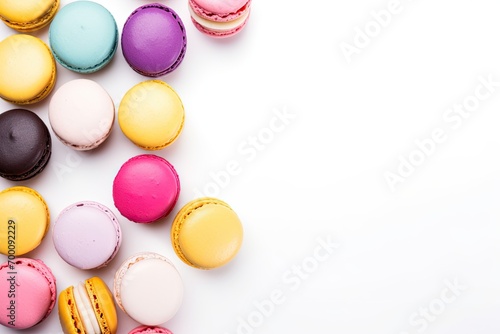 Obraz premium Multicolored macarons on white background from above