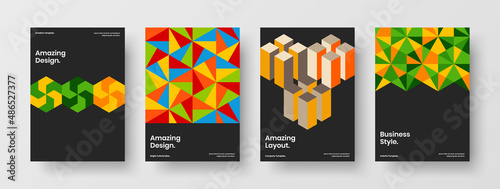 Naklejka premium Multicolored mosaic hexagons company brochure template composition. Fresh booklet design vector layout collection.