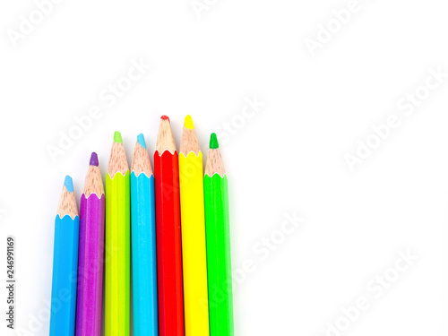 © Wachiraphorn Thongya, Fototapeta premium Multicolored pencils with free space for text on white background, Color pencils isolated