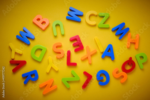 Fototapeta premium Multicolored plastic letters make word dyslexia on yellow background....