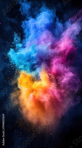 Fototapeta premium Multicolored rainbow powder paint explosion background, Holi on dark background, abstract background