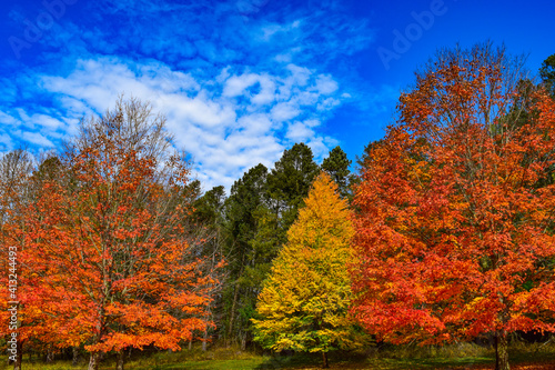 © Andrea Gluckman, Fototapeta premium Multicolored Trees in Autumn with Blue Sky