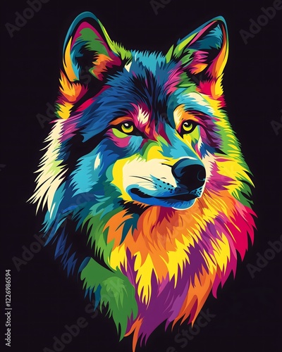 © Mathias, Naklejka premium Multicolored wolf portrait logo on a black background