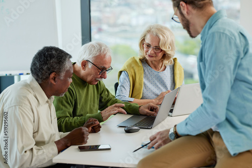 Obraz premium Multicultural group of senior students asking questions their tutor who showing them solution.