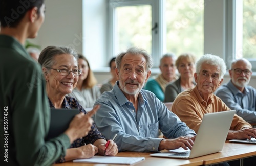 © miss irine, Obraz premium Multicultural group senior people learning in classroom using laptops. Elderly students study with teacher, mentor. Modern tech and online education for retired adults, lifelong learning.
