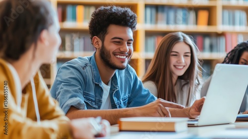 Fototapeta premium Multicultural students collaborating in a bright library environment