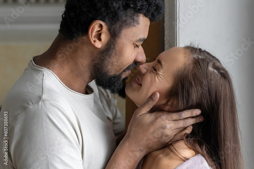 © Chiralli, Fototapeta premium Multiethnic American couple embracing at home.
