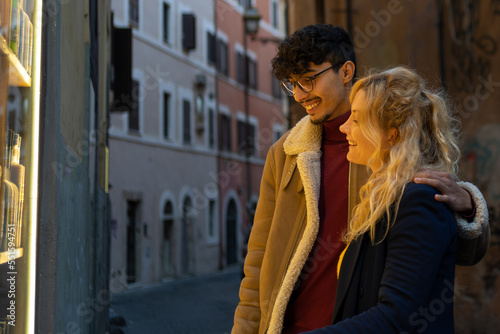 © victor cuenca lopez, Fototapeta premium Multiethnic couple looking at a shop window