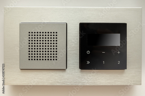 © RokaB, Obraz premium Multifunction outlet with speaker and touchpad on a wall.
