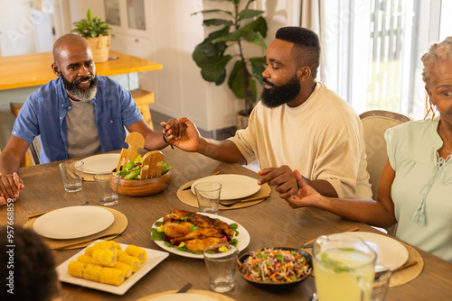 Fototapeta premium multigenerational family holding hands and praying before meal, gathered...