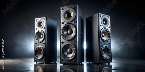 Obraz premium Multimedia acoustic sound speakers with two satellites and subwoofer on dark background , sound speakers