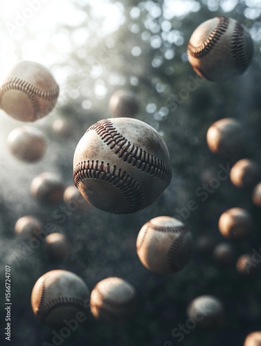 Fototapeta premium Multiple Baseballs Floating in Dusty Atmosphere Cinematic Sports Scene