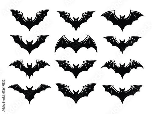 Naklejka premium Multiple bat silhouettes in flight, dark black vector symbols perfect for...