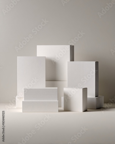 © zuriya, Fototapeta premium multiple blank white packaging boxes in different sizes on a seamless neutral backdrop, premium mockup composition.