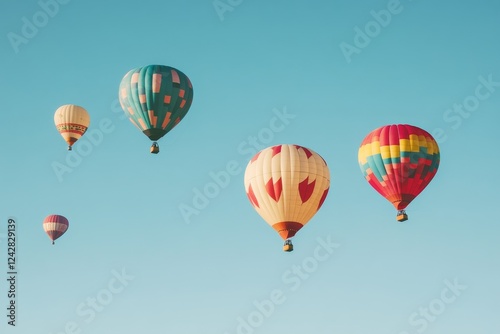 © Artsaba Family, Fototapeta premium Multiple colorful hot air balloons floating in a clear blue sky during a daytime festival