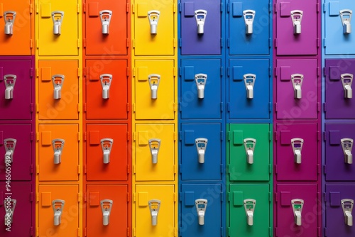© Oratai, Fototapeta premium Multiple colorful school lockers with individual locks, arranged in a neat row