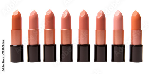 Obraz premium Multiple different tone peach fuzz color lipstick in a black case in a row on a white background. Make up a product photo shoot. Copy space, PNG, transparent background.