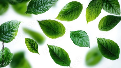 © Jdgkxbnc, Fototapeta premium Multiple fresh green leaves floating against a bright white background conveying freshness and natural beauty