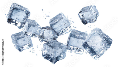 © PNGuin Studio, Obraz premium Multiple frozen ice cubes scattered with water drops, isolated on transparent cutout background