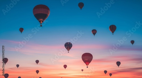 Obraz premium Multiple Hot Air Balloons Soaring at Sunset: A Breathtaking Aerial View