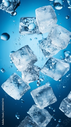 Obraz premium Multiple Ice Cubes Falling Through Water, Closeup, Blue Background