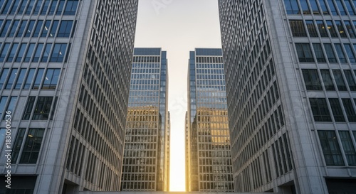 © alinka, Obraz premium Multiple modern skyscrapers frame a bright sunlit gap between them