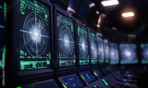 © jambulart, Obraz premium Multiple monitors displaying radar screens.