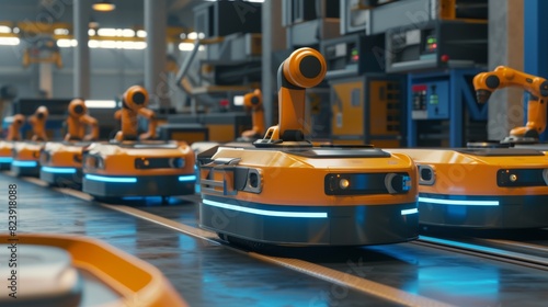Fototapeta premium Multiple orange robotic arms operating simultaneously in a busy,...