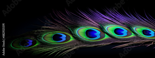 © Paul Peery, Obraz premium Multiple Peacock Feathers in a Dark Background Displaying Vibrant Colors