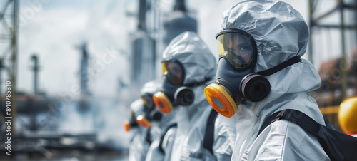 © Katsiaryna, Naklejka premium Multiple people wearing protective suits and gas masks in front of an oil plant