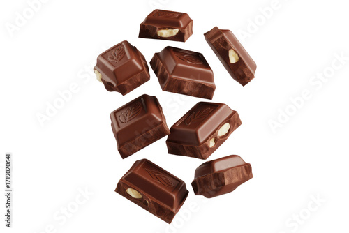 Fototapeta premium Multiple pieces of milk chocolate with hazelnuts levitate against a transparent background. background removed
