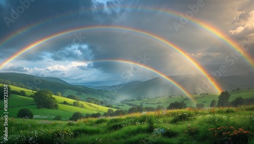 Naklejka premium Multiple rainbows arching over lush green hills under a dramatic sky after a rainstorm in the countryside