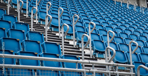 Naklejka premium multiple row of blue reserved empty chair, seat in stadium for soccer, football sport game and festival or concert in lined up in a row for audience