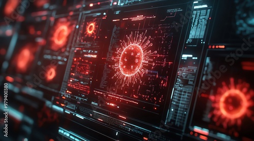 Obraz premium Multiple screens displaying virus data, cyber environment, glowing red...