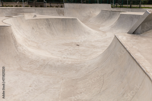 Fototapeta premium Multiple smooth concrete ramps and bowls are designed for skateboarding and...