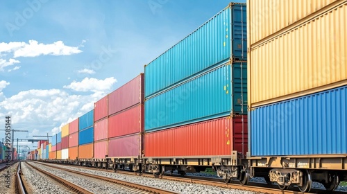 © NATTAWUT, Obraz premium Multiple train carriages stacked with containers in a logistics hub