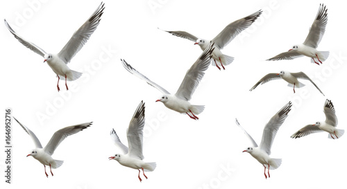 © Sung, Obraz premium Multiple white gulls in dynamic flight, pristine plumage, subtle black/grey markings, reddish-orange accents, sharp focus against a transparent studio background with negative space. Concept of