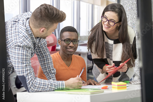 © FS-Stock, Obraz premium Multiracial contemporary business people working connected with technological devices like tablet and laptop